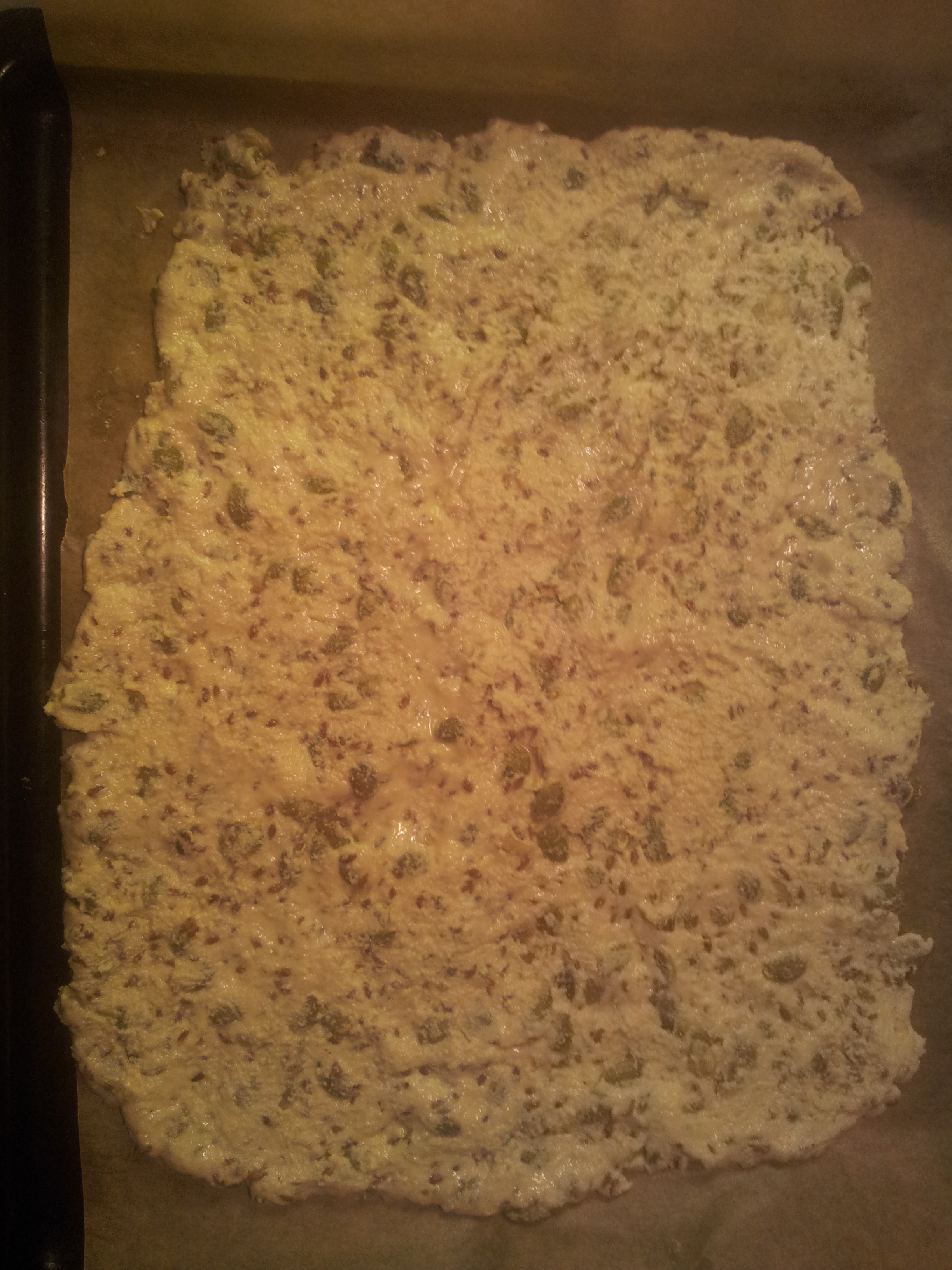 Je hebt er maar tien minuten werk mee en er is bijna geen afwas aan. Eén kom waarin rijstmeel, pompoenpitten, lijnzaad, olijfolie, water, zout en kruiden gaan, even roeren, op een bakplaat leggen en de oven in. Ik maak ze meestal als één grote koek en breek ze daarna in stukken. Als je mooiere vierkantjes wil maken, kun je het deeg met een mes snijden in de gewenste stukken voor het de oven in gaat. De hoeveelheid hieronder is voor een hele doos rijstcrackers, zoveel er op één bakplaat passen en zoveel ik erop kan (maar eigenlijk zijn het met gemak 2 porties). Als je er ineens voor meerdere dagen of personen wil maken, verdubbel dan gewoon de hoeveelheid en gebruik twee bakplaten. Je kan de crackers makkelijk drie dagen bewaren in een luchtdichte doos.