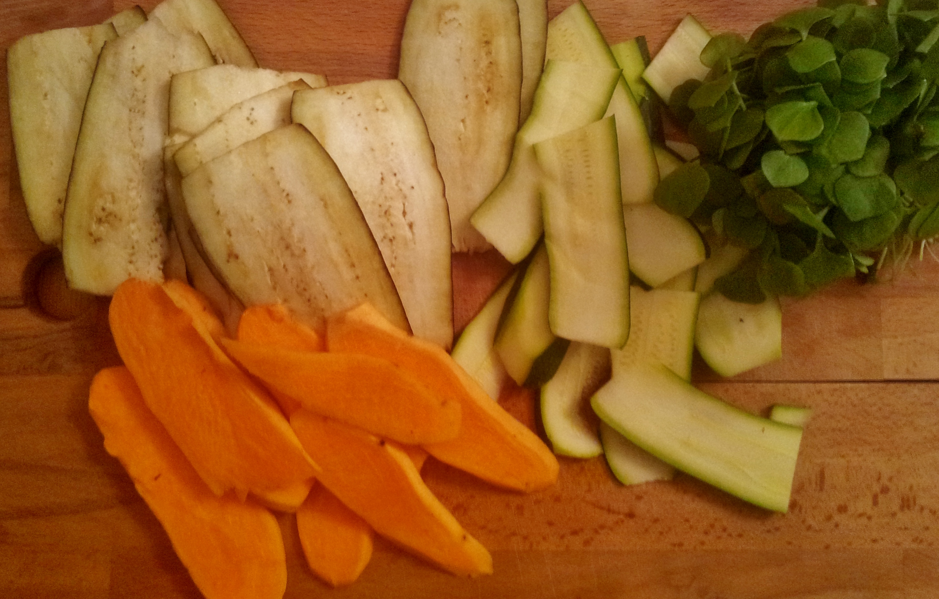 Dit recept zet je al in zo’n 15 minuten op tafel. Het meeste werk kruipt hier in het snijden van de groentjes en het wassen van de sla. (Bij biologisch bladgroen wil het al eens voorkomen dat er nog wat grond aanhangt, maar dat is alleen maar een goed teken. Zo merk je dat je sla recht van het veld komt!) In deze ‘snelle’ versie gril ik de groentjes vijf minuutjes in de pan. Als je meer tijd hebt, kun je ze ook zo’n 30 minuten in de oven grillen op 180°C. Besprenkel ze dan wel met voldoende olijfolie zodat ze mooi goudbruin worden en de aubergines niet uitdrogen.