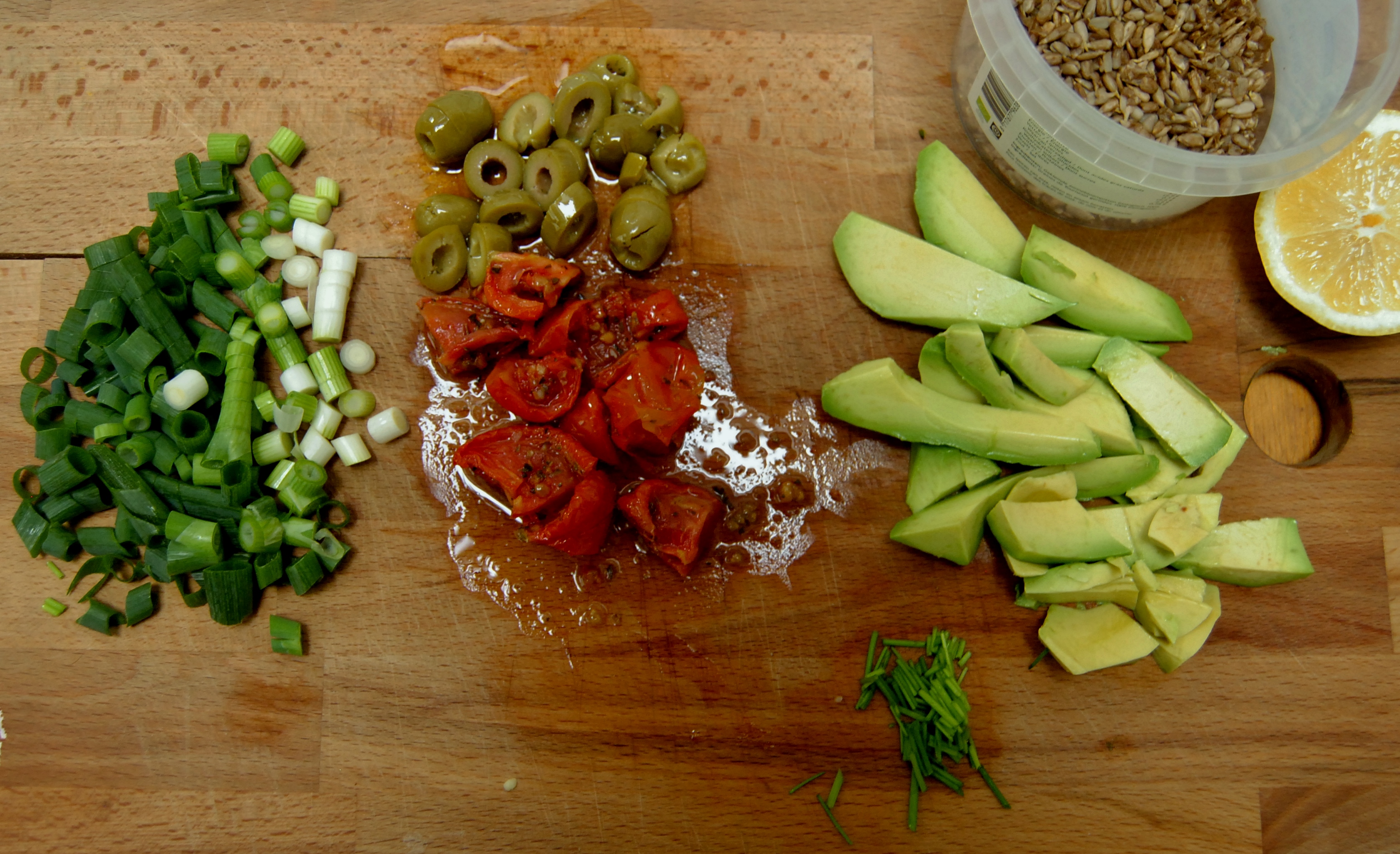 Wanneer je klaar bent om de salade te maken snij je de lente-ui, zongedroogde tomaten en olijfjes zo fijn je wil. Pel en ontpit de avocado, snij in stukken en knijp hier een beetje limoensap over uit. Als je de mogelijkheid hebt, rooster de zonnebloempitten dan even in een pan op een laag vuurtje tot ze goudbruin zijn. Dit versterkt de smaak en maakt de pitjes beter verteerbaar. Doe alle ingrediënten bij de quinoa, knijp een halve limoen of citroen uit boven de salade, overgiet met een scheutje olijfolie en bestrooi met kruiden. Meng alles door elkaar en je salade is klaar!