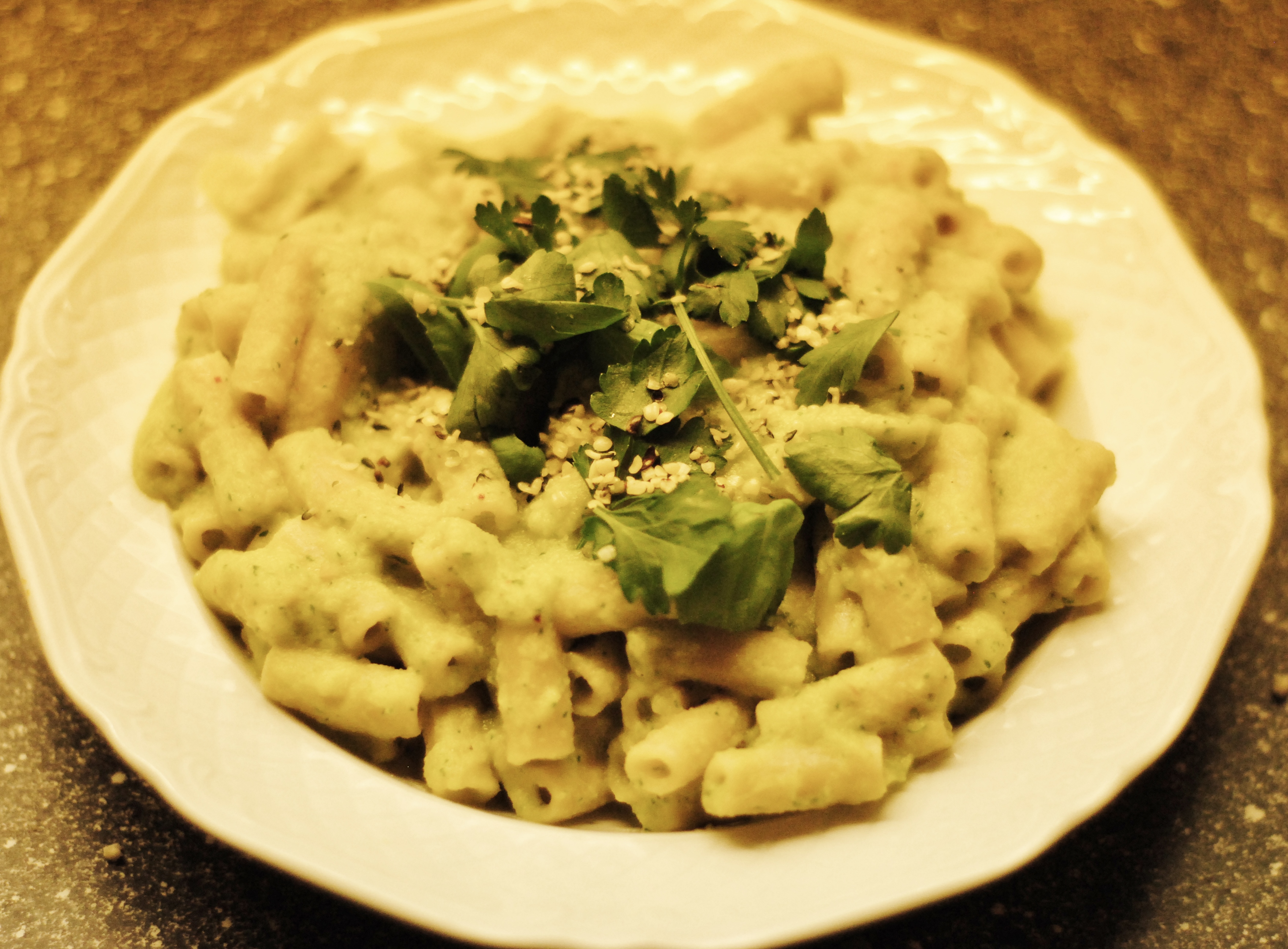Serveer de pasta met de rest van de verse peterselie, de hennepzaadjes en de geroosterde pitjes.