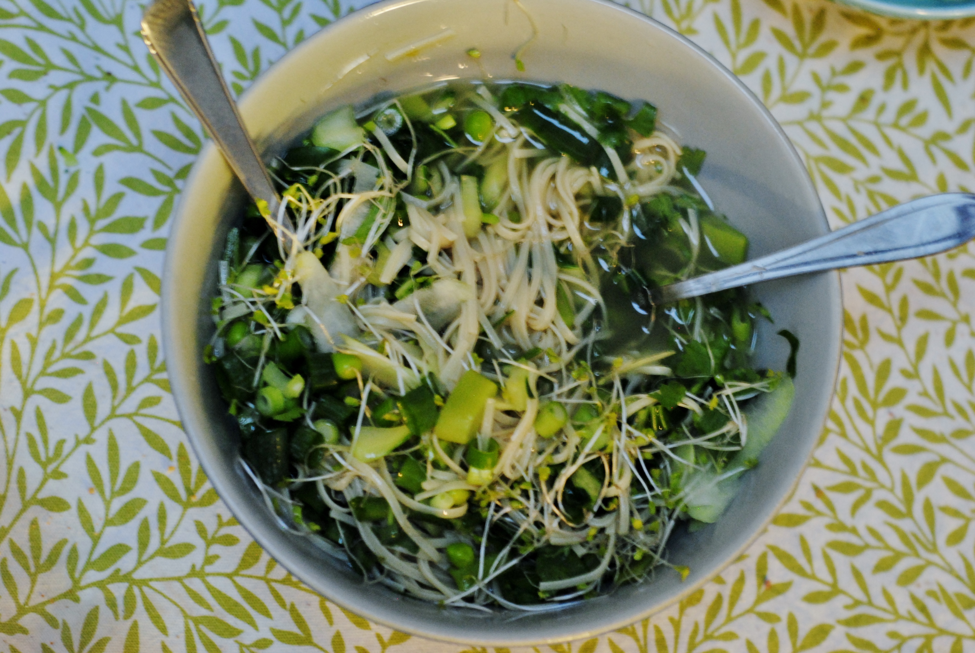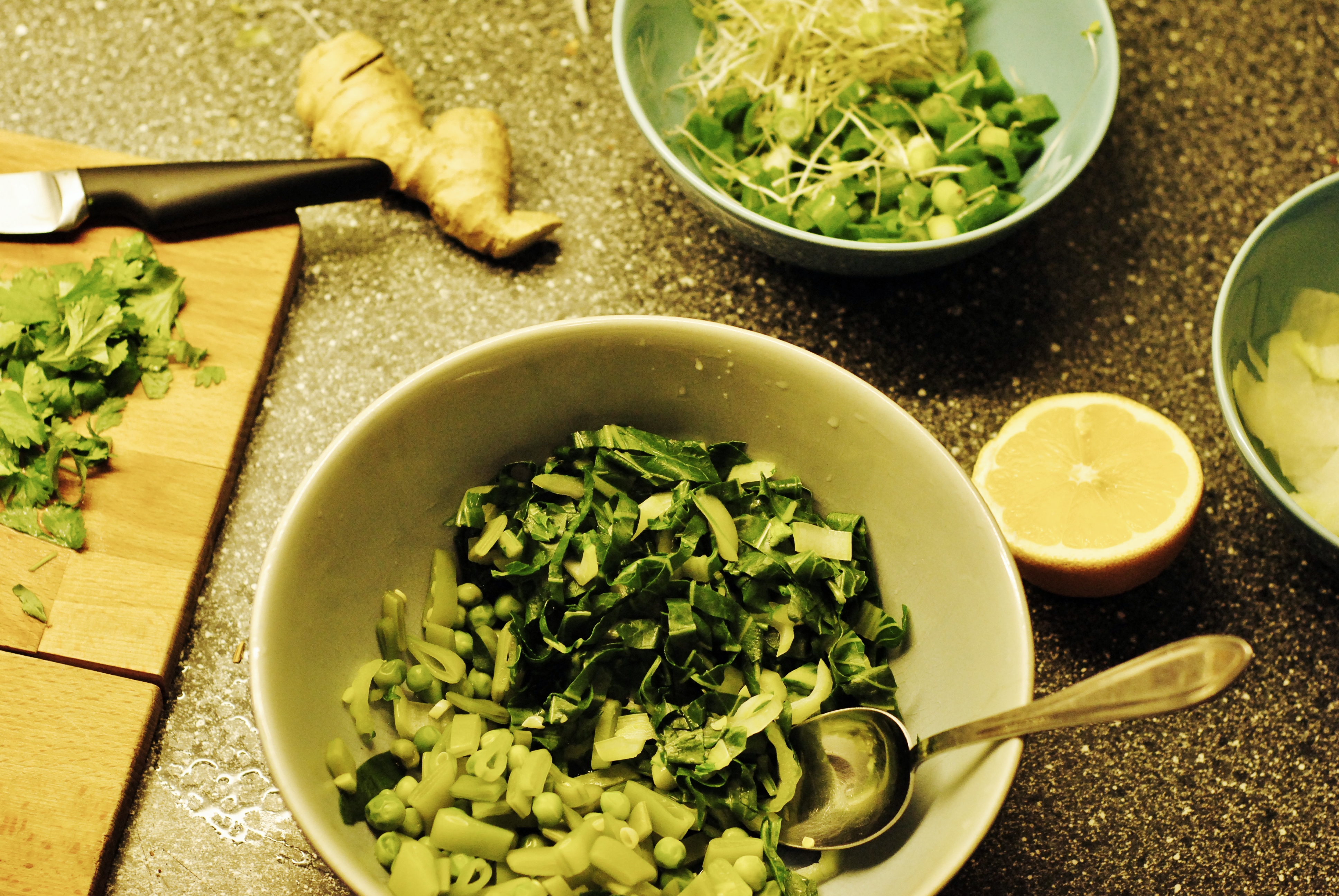 Over naar de andere ingrediënten van deze fantastische noedel bowl: noedels en groene groenten. Gebruik bruine rijstnoedels of 100% soba (boekweit) noedels, verkrijgbaar in de natuurwinkel of in de aziatische supermarkt. Wat betreft de groene groenten kan je oneindig variëren naargelang het seizoen: gebruik zeker een paar soorten bladgroen (meestal rijk aan ijzer en vitamine C), boontjes of verse doperwtjes (rijk aan calcium en ijzer), scheuten of kiemen, lente-ui voor de smaak, kolen zoals broccoli of koolrabi, en verse koriander voor de finishing touch. Het recept dat ik hieronder geef is dus maar een indicator voor wat je kan gebruiken. Veel plezier en creativiteit ermee gewenst!