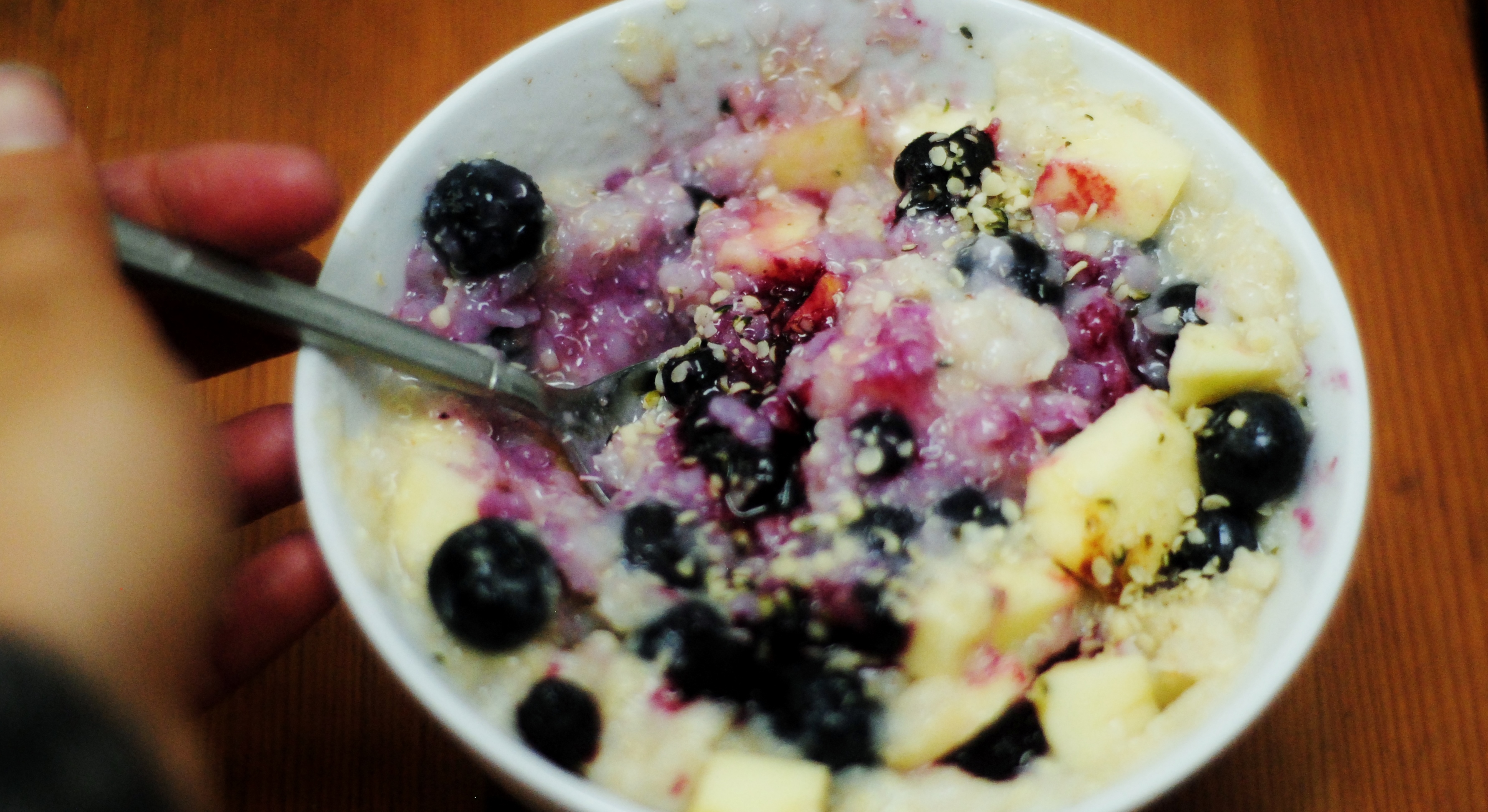 Tip: Deze porridge is ook handig te maken op vakantie of op een ander als je een keuken kan gebruiken. Ik maak dan op voorhand een mix van rijstvlokken, quinoavlokken, hennepzaad en kaneel en neem die mee in een luchtdichte trommel, samen met een busje rijstmelk. Als je geen plantaardige melk voorhanden hebt kun je zelfs water gebruiken voor de pap, maar dan moet je ‘m wat meer zoeten met bijvoorbeeld esdoornsiroop, confituur, dadels of vijgen.
