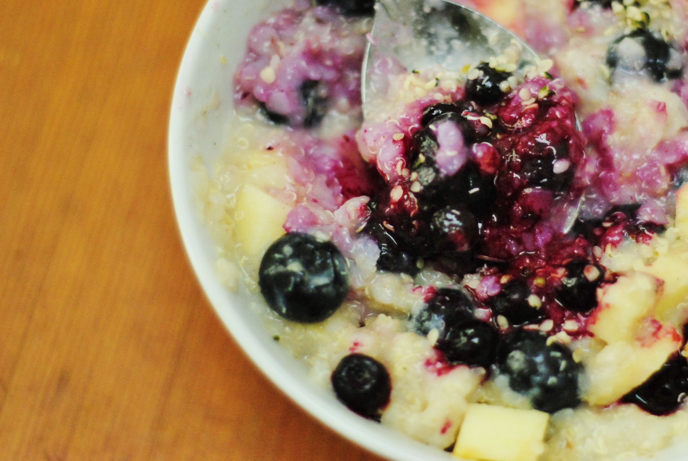 Bovendien is deze ontbijtpap de (kleine) moeite meer dan waard: ze is zo heerlijk smeuïg, verwarmend en vullend. Op koude of vroege ochtenden is ze mijn favoriete ontbijt om me te helpen de komende dag door te komen. Vroeger, toen ik net te horen had gekregen dat ik allergisch was aan gluten en havermout, at ik deze pap elke dag: ze was gewoonweg het enige ontbijt dat ik kon bedenken. Tegenwoordig heb ik een heel gamma aan ontbijtmogelijkheden ontwikkeld, maar toch grijp ik met name in de winter nog vaak naar deze pap. In de zomer val ik wat minder terug op mijn favoriete porridge, maar ook dan kan ik af en toe zo snacken naar een hartverwarmend ontbijt dat ik ze nog minstens één maal per week maak.