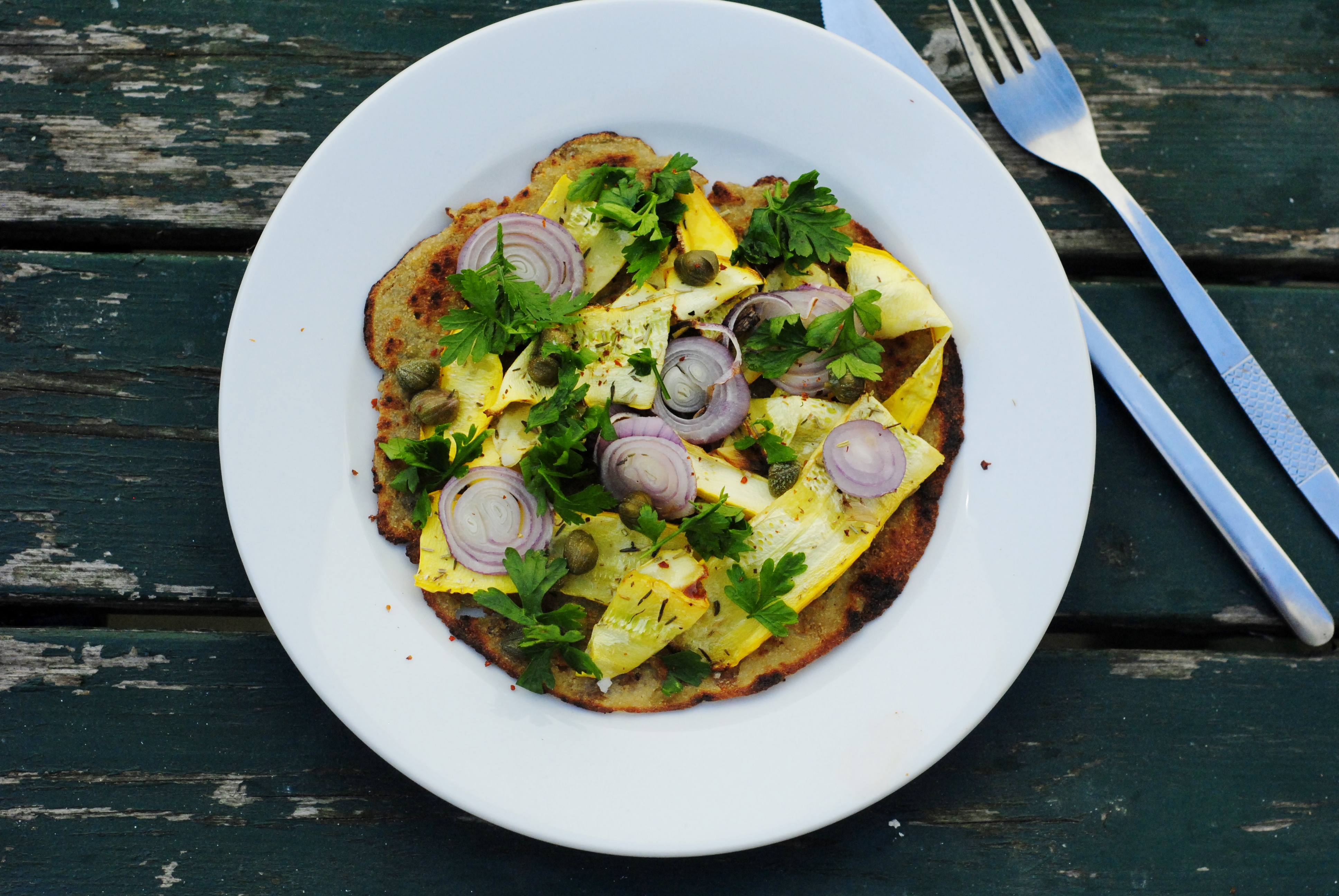 Voor een ultiem zomers beleg van mijn socca gebruikte ik courgettes. Deze groente is zowat hét bewijs van de overvloed van de zomer omdat ze zo ongelooflijk snel en in grote getale groeit. Op de boerderij waar ik werk hebben we ze dan ook in overvloed en courgette is zo uitgegroeid tot mijn nieuwe staple food. Iets waar ik niet over zal klagen, want courgettes zijn ook nog eens één van mijn lievelingsgroentes. Zowel de groene als de gele varianten zijn heerlijk (eigenlijk smaken ze vrijwel hetzelfde, maar probeer eens allebei uit om te variëren met kleur in gerechten). Je kan ze gebruiken op ontelbare manieren. Wanneer je ze grilt in de oven of pan, zoals in dit recept, krijgen de courgettes een heerlijk licht gerookt aroma wat ze ideaal maakt als smaakvolle vleesvervangers op pizza’s en broden. De uitjes, cayenne en zoute kappertjes maken dit veganistische geheel af en de bladpeterselie voegt naast veel smaak ook een extra dosis vitaminen en mineralen toe. Ben je geen veganist, dan kun je de kappertjes vervangen (of aanvullen) door een handjevol verkruimelde feta. Ben je geen vegetariër, dan zijn een paar fijngesneden ansjovissen ook een heerlijke toevoeging op deze socca.
