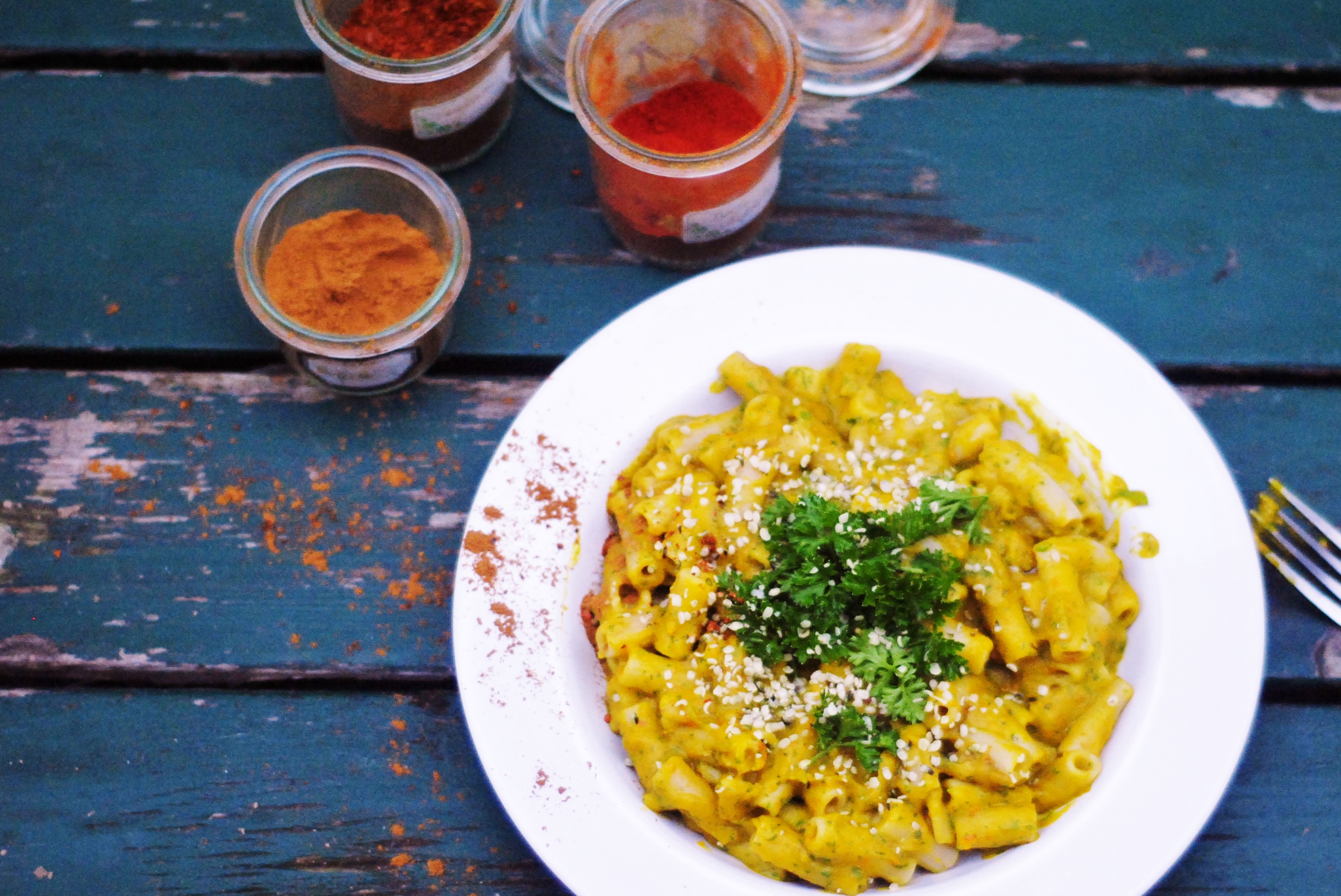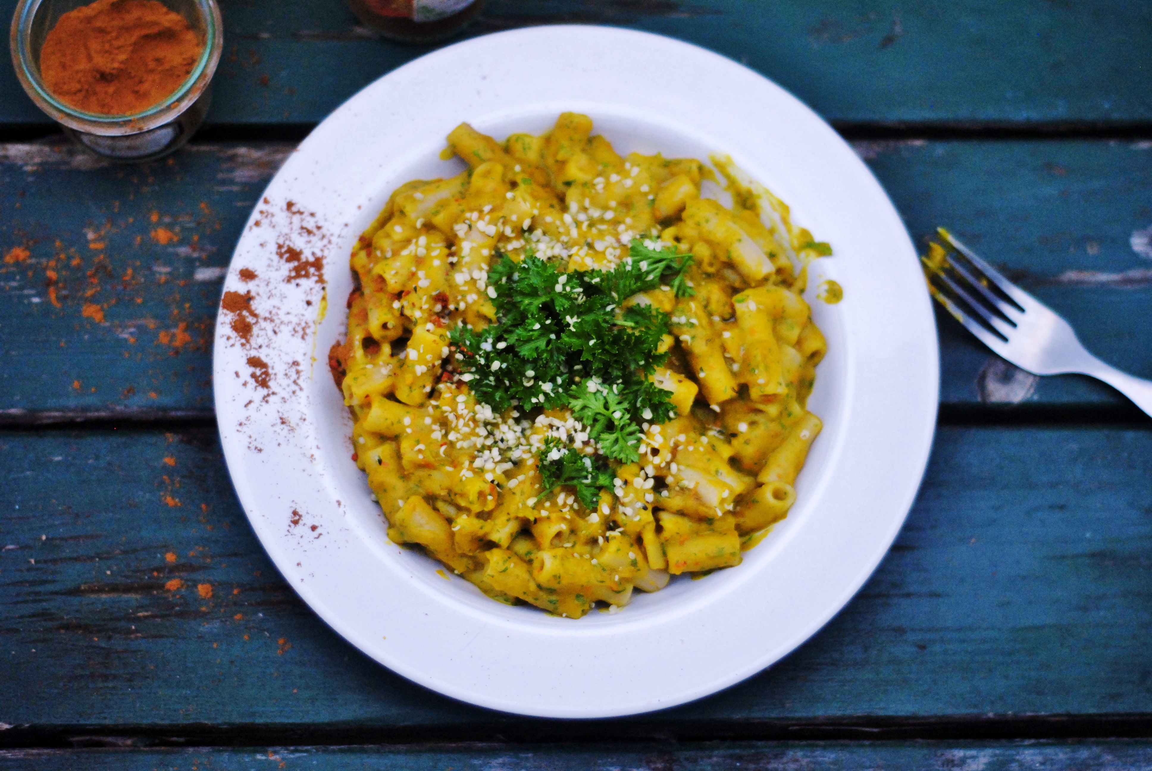 Ik heb deze pasta op smaak gebracht met verwarmende kruiden zoals ontstekingsremmende gember, energie-boosting cayennepeper, zoete paprika, geurige nootmusaat, kaneel, en kruidnagel – deze laatste zijn naast lekker ook beproefde schimmelwerende en infectie-werende kruiden. Het geheel is een heerlijk romige, dikke, kruidige pastasaus die je lekker kan opsmullen met een boek en dekentje in de zetel. Laat de herfst nu maar losbarsten.